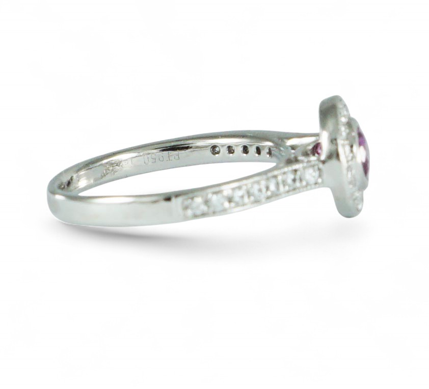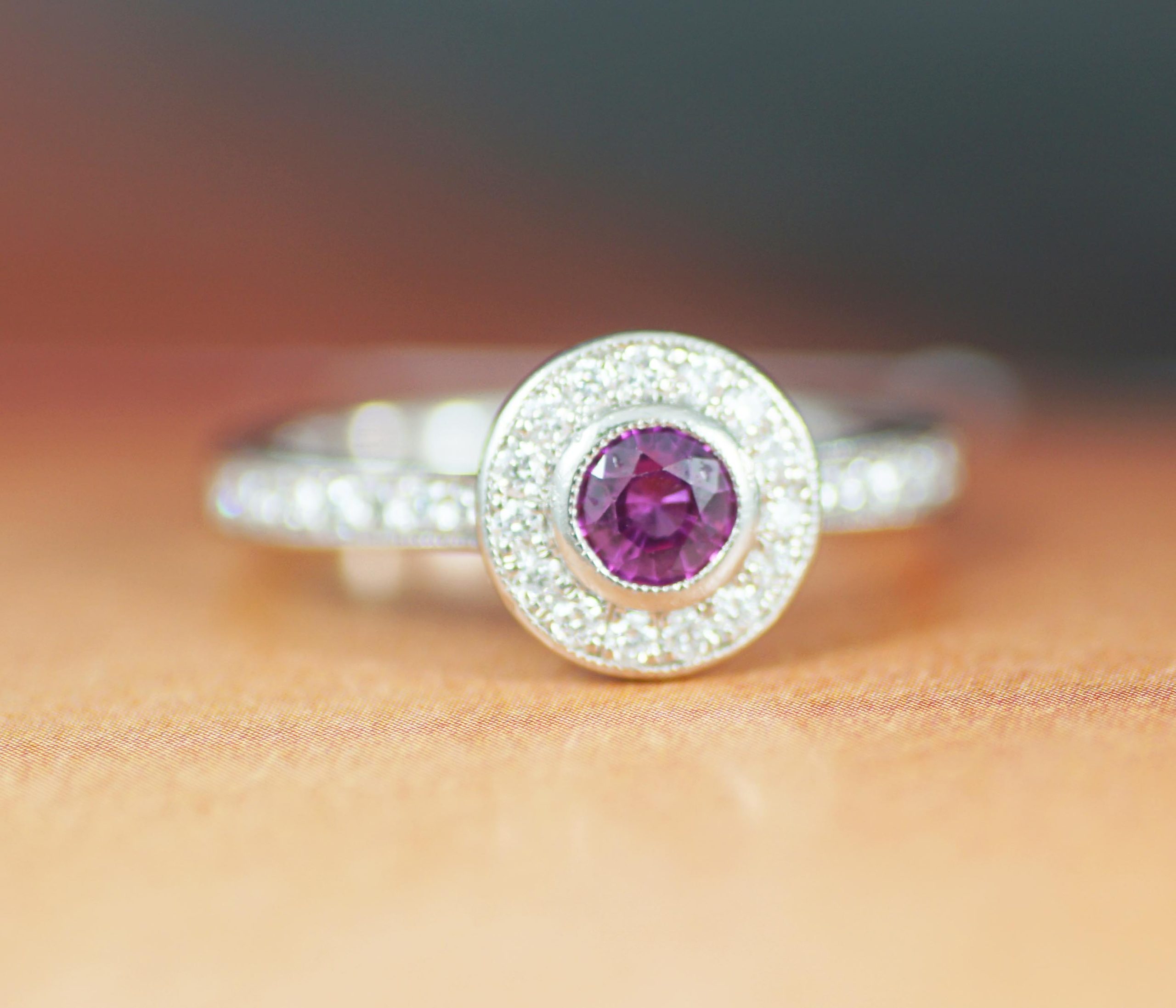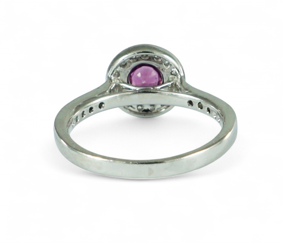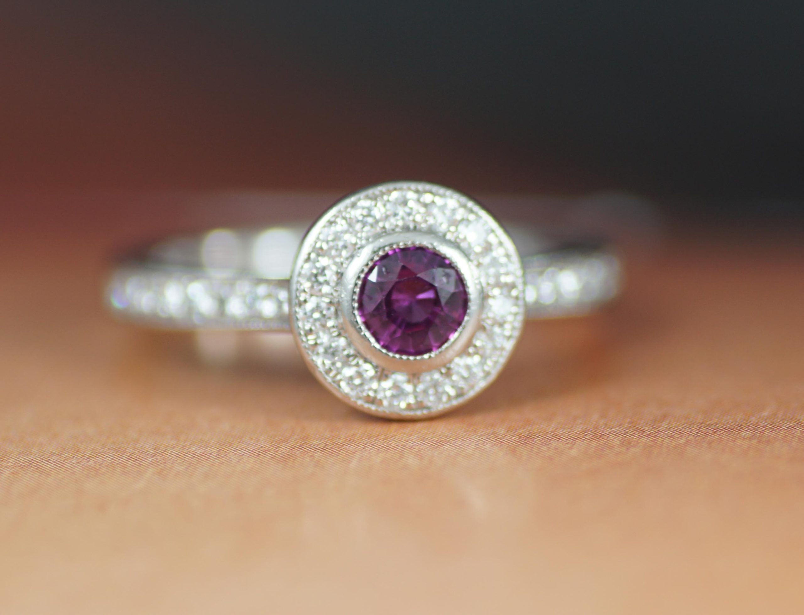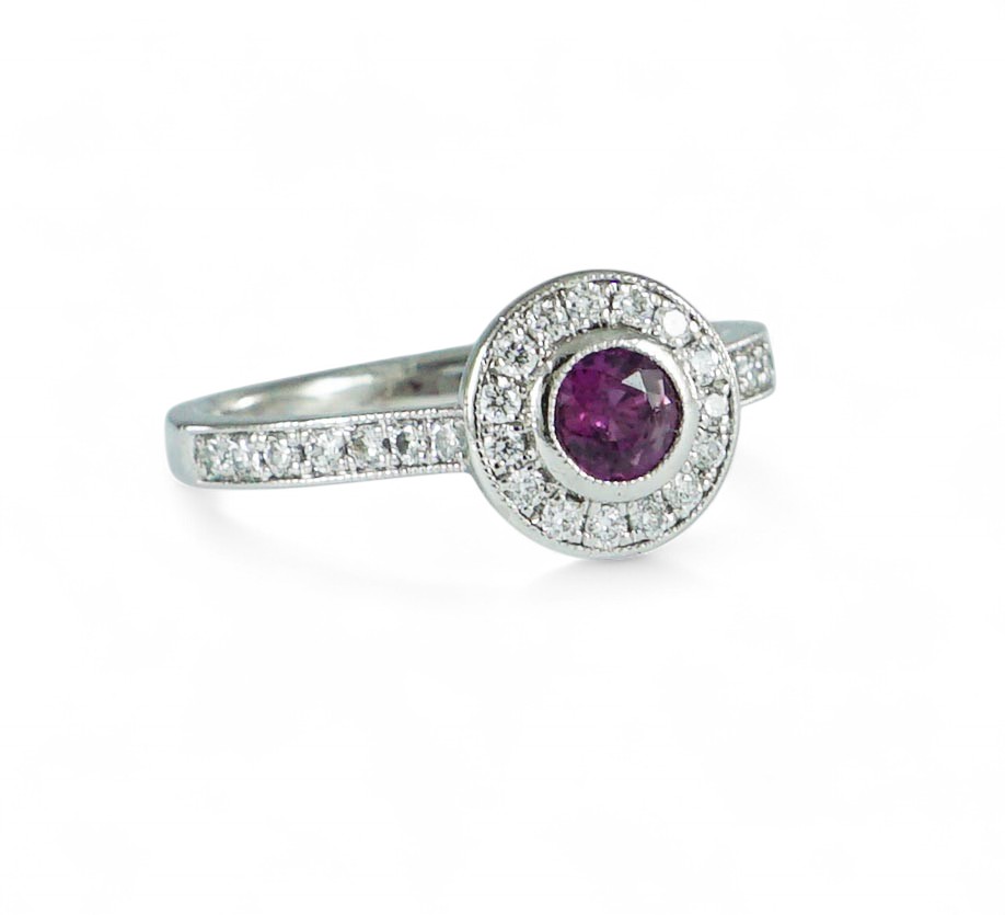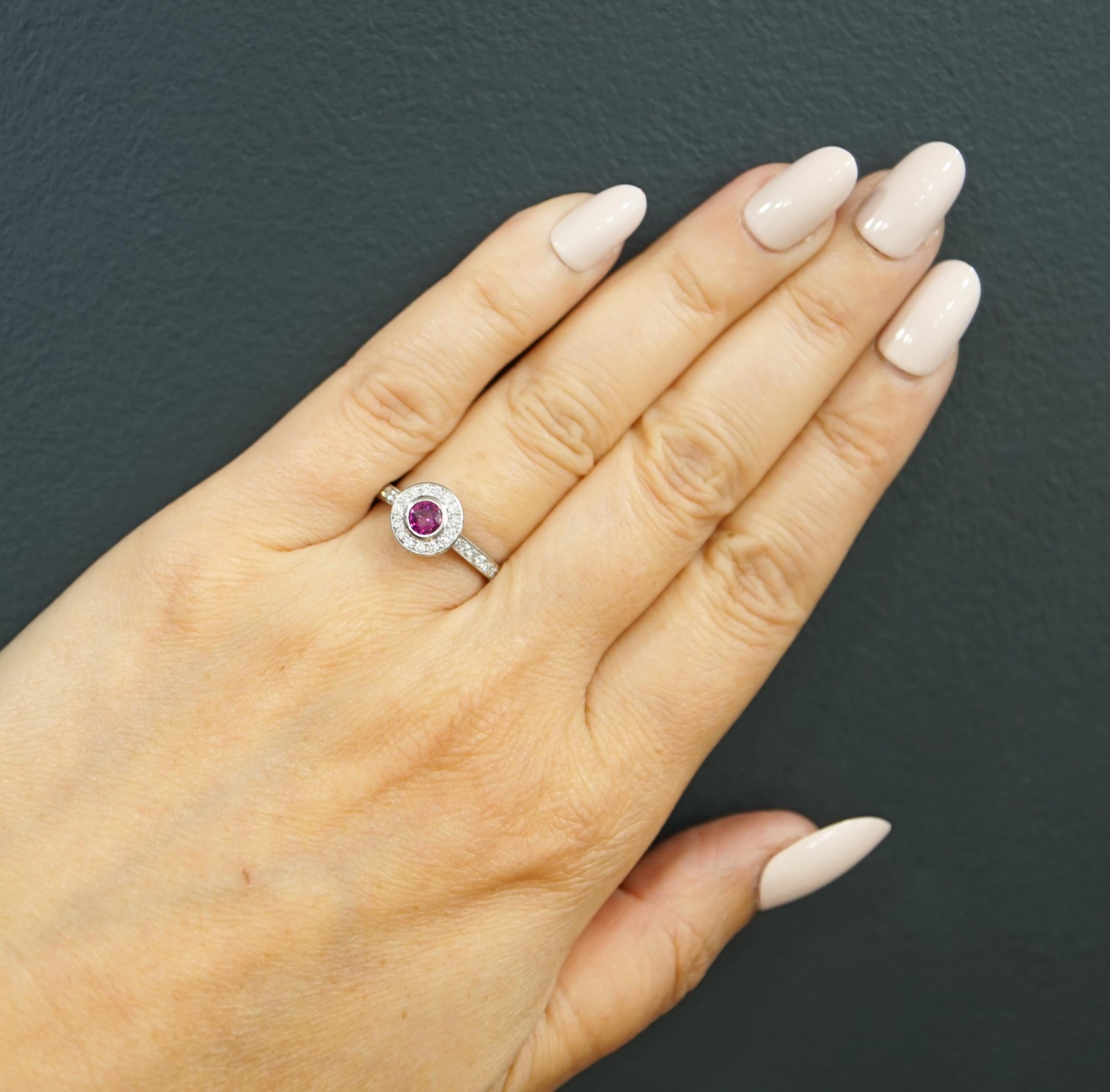 one central ruby, rub over set and surrounded by a halo of modern round brilliant cut diamond