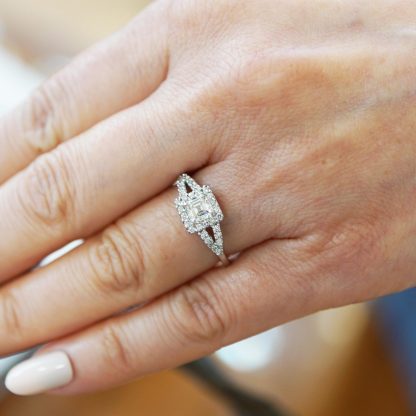 A modern diamond halo ring with a central Asscher Cut Diamond  set in 18ct white gold