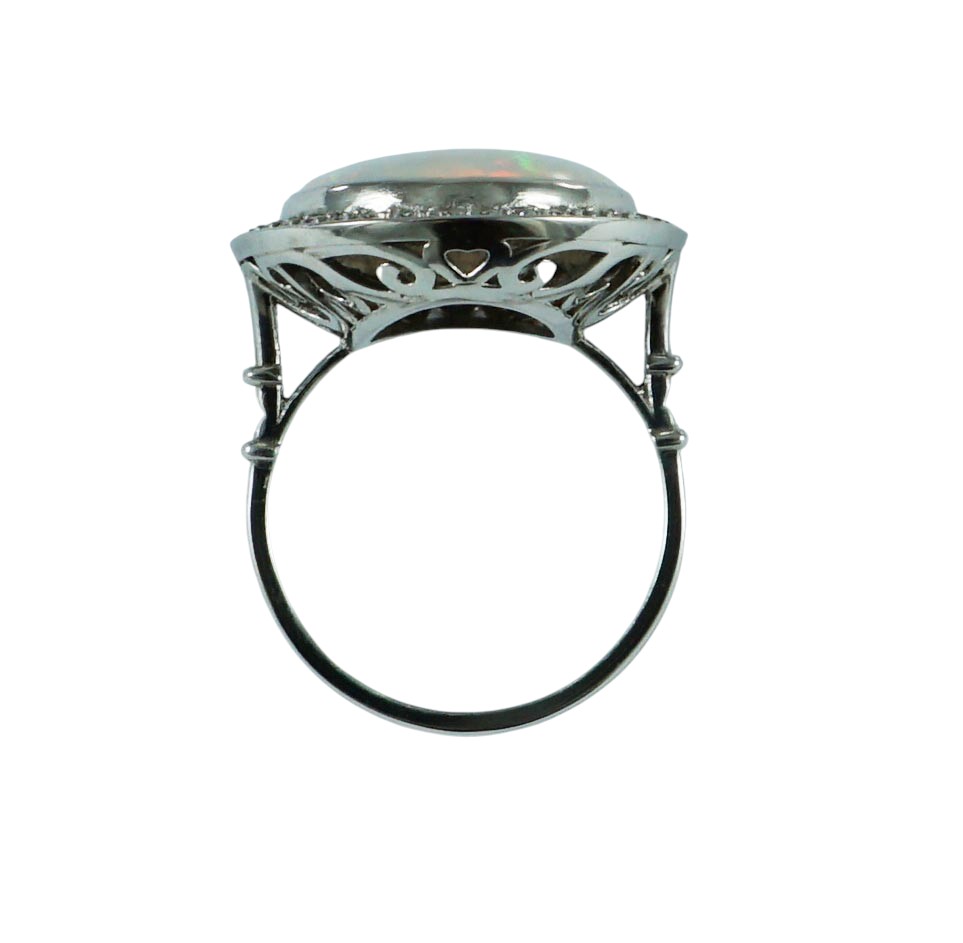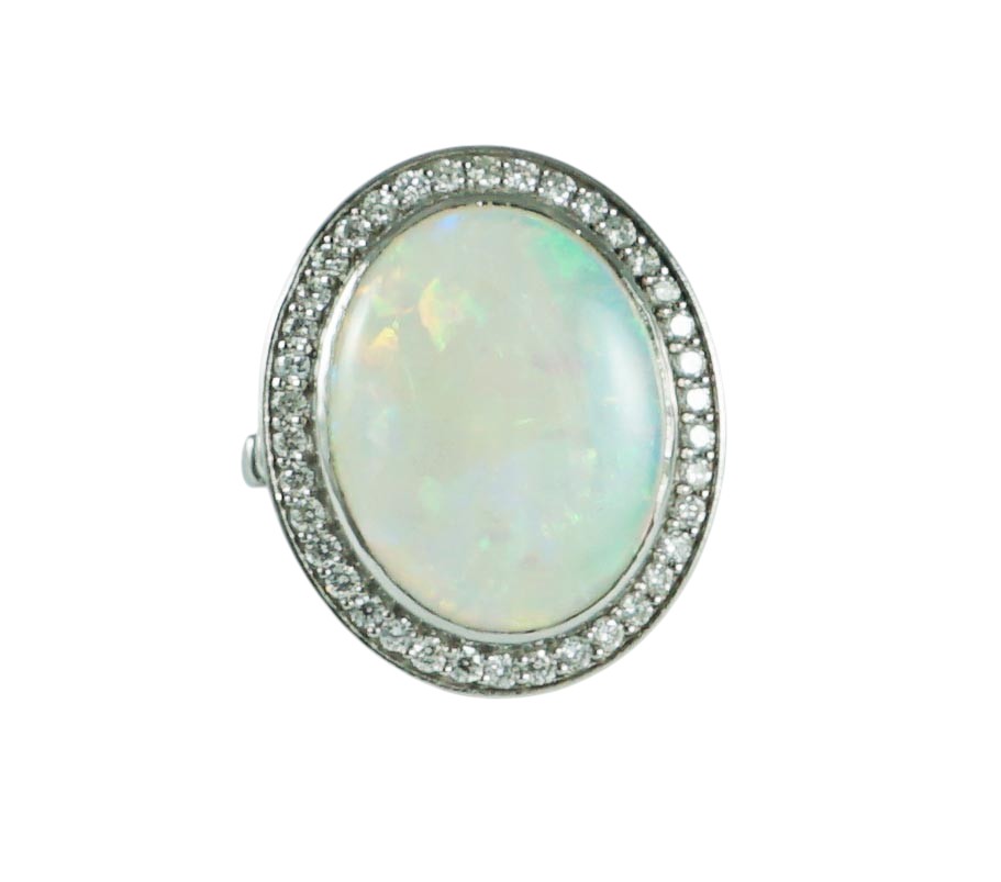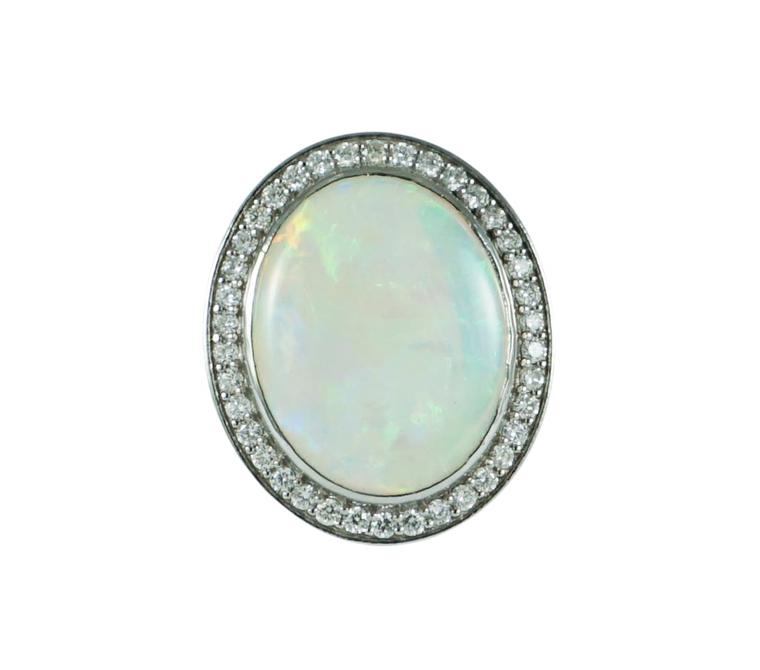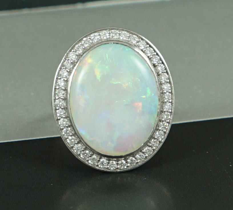 A spectacular Opal and Diamond Ring, one oval cut opal bezel set in a platinum mount