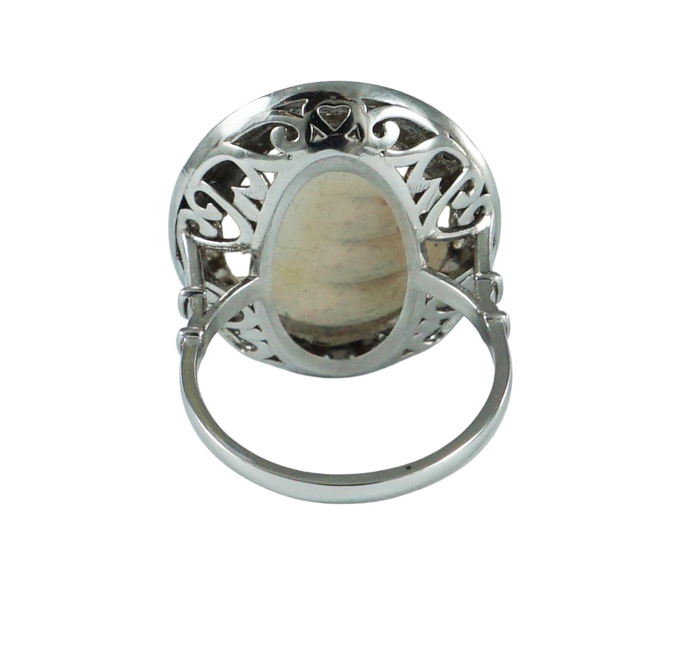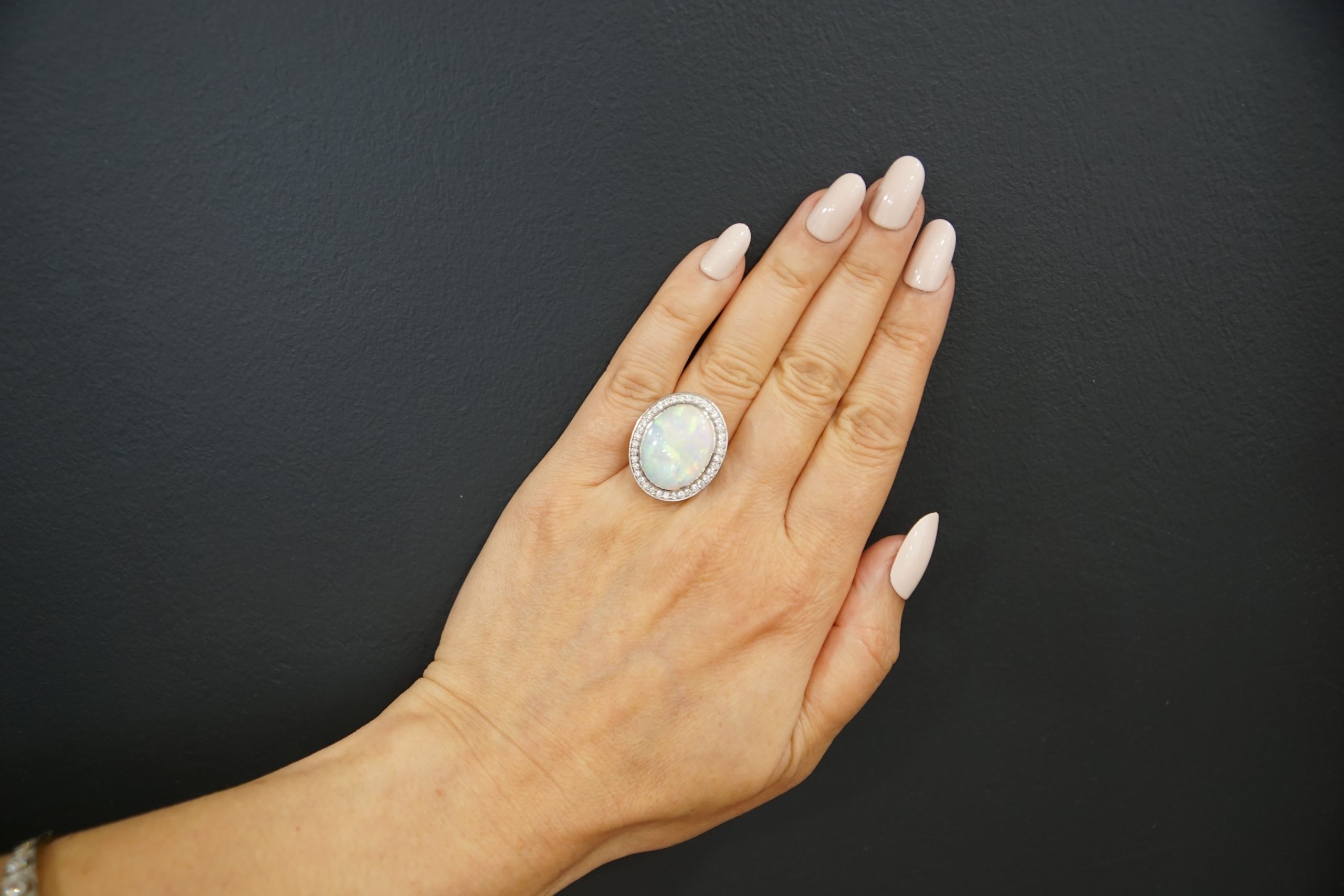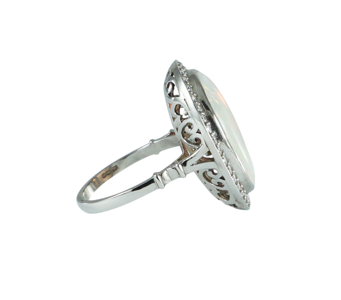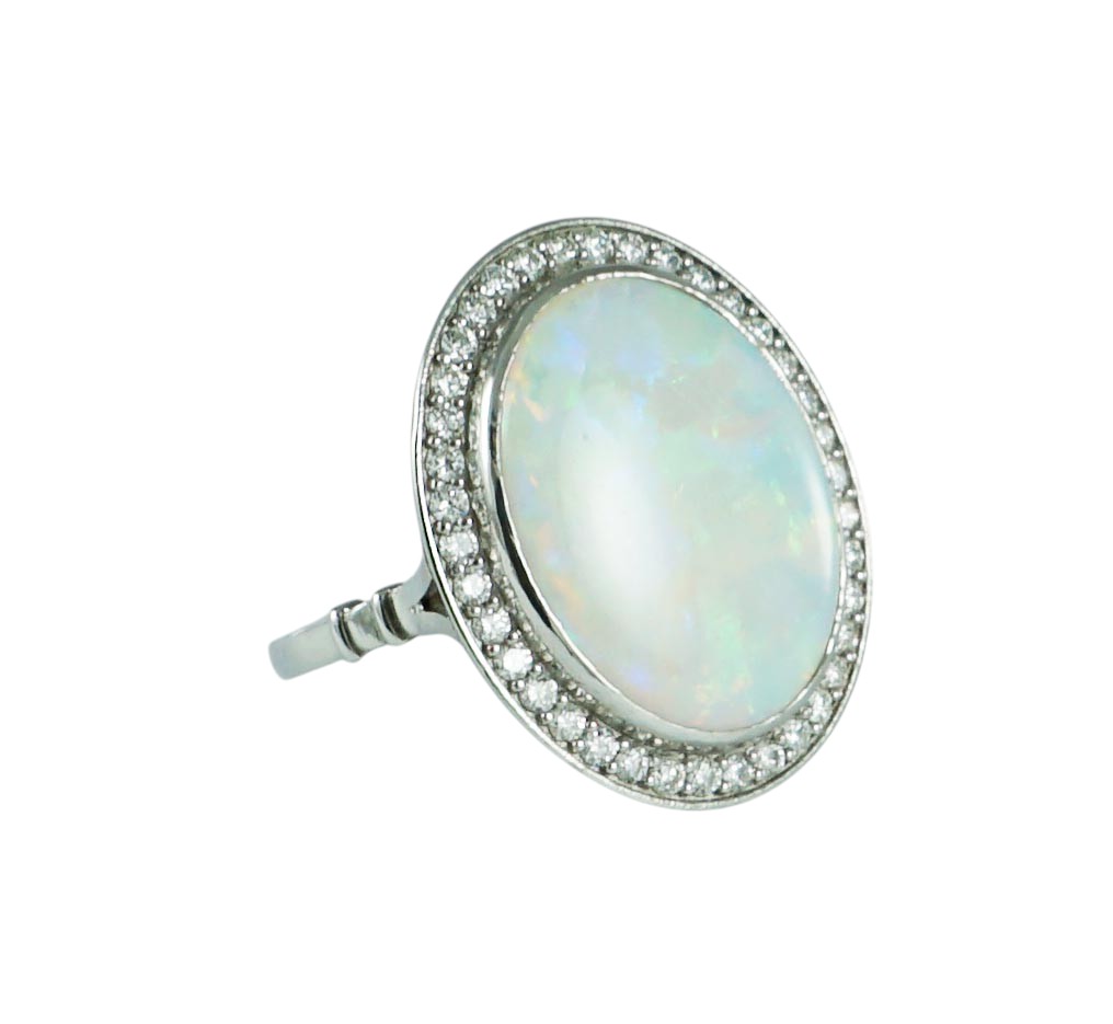 A spectacular Opal and Diamond Ring, one oval cut opal bezel set in a platinum mount