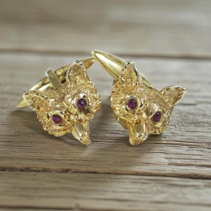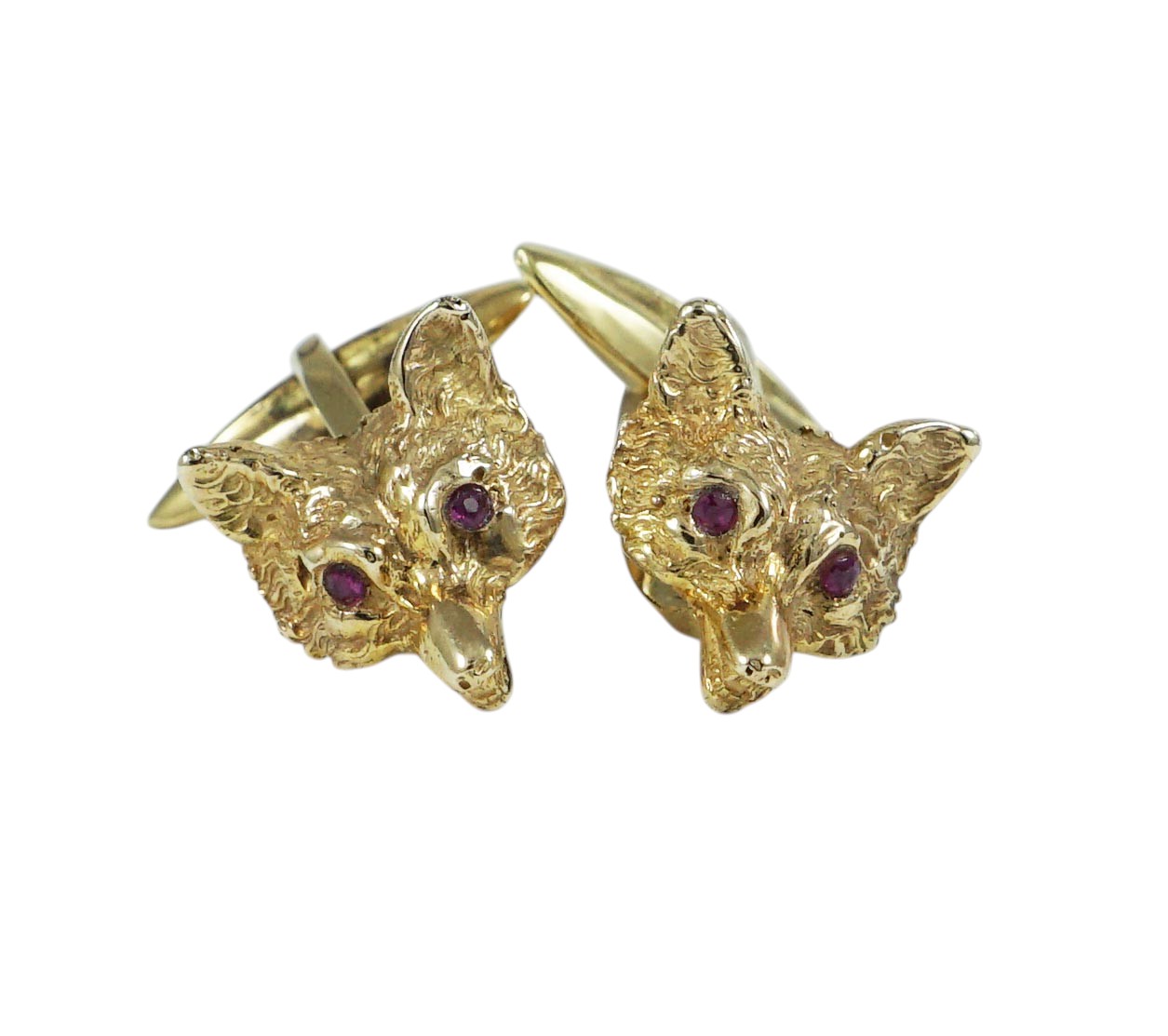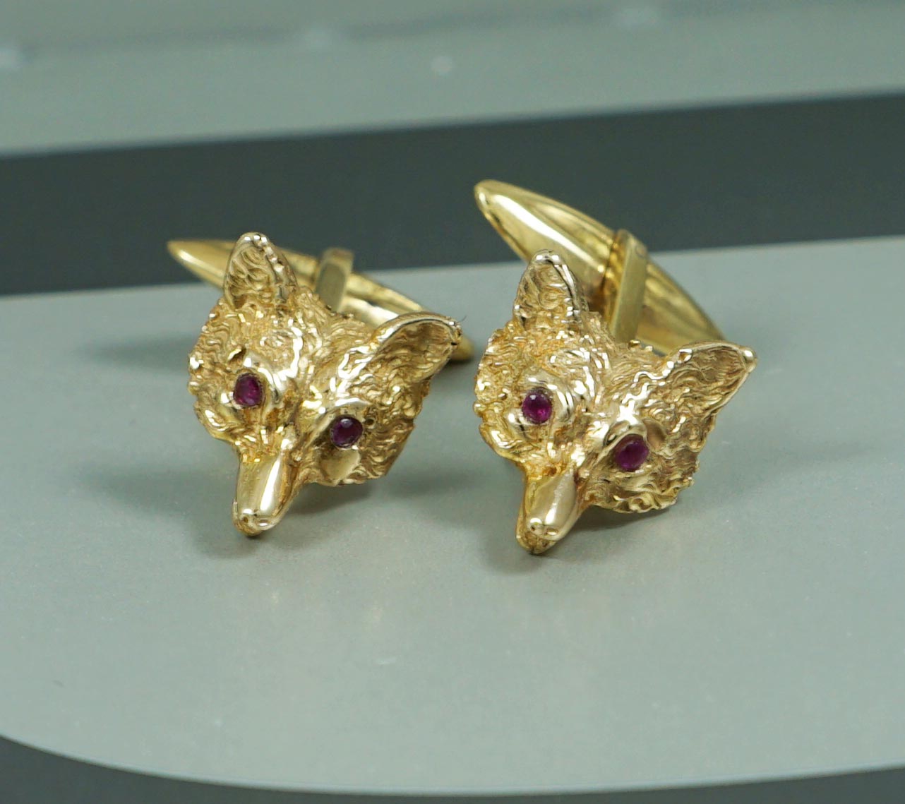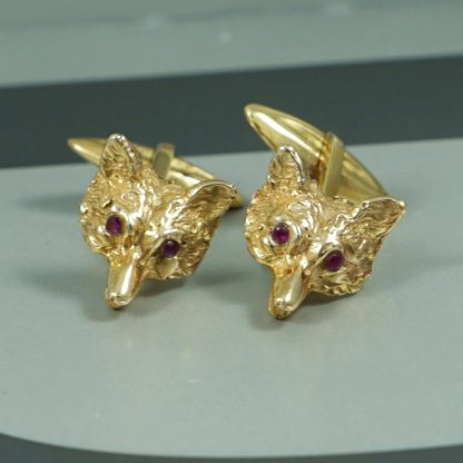 A pair of solid gold fox cufflinks with Ruby set eyes