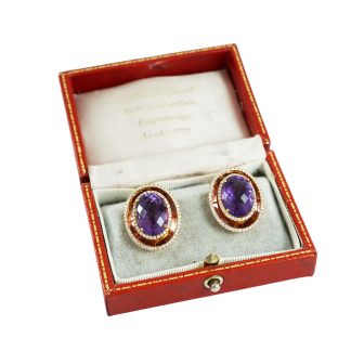 central old cushion cut diamonds claw set and surrounded by a halo of modern brilliant cut diamonds with detachable diamond drop earrings.