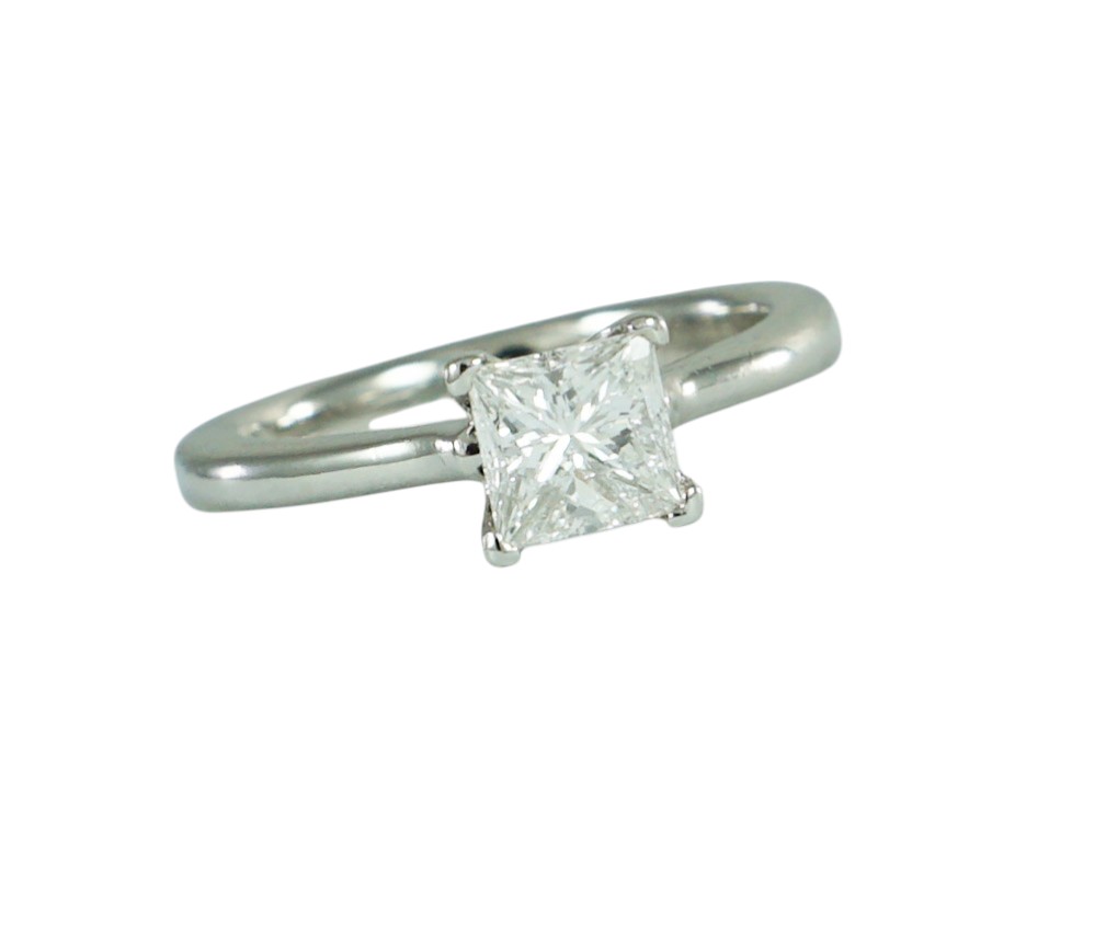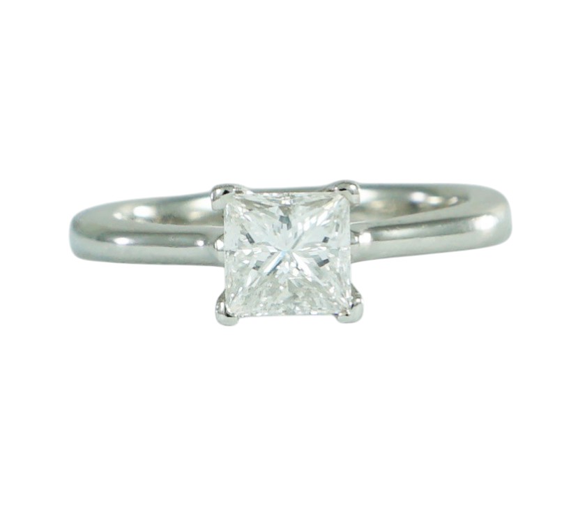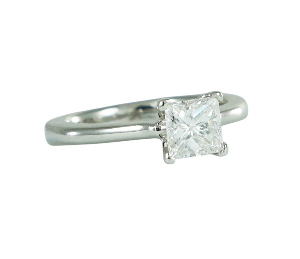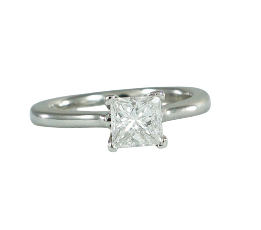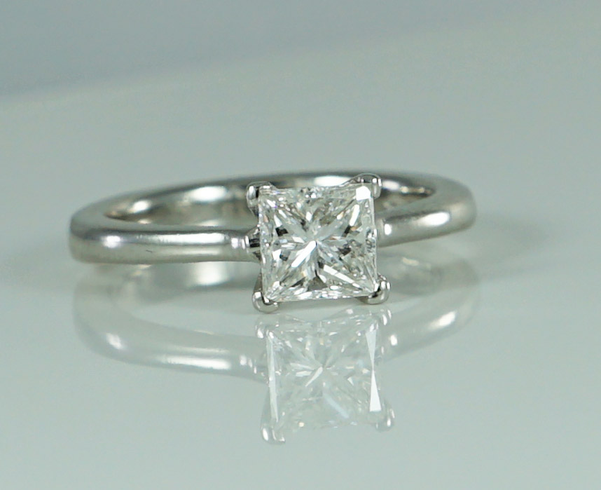 A modern Princess Cut Diamond ring claw set in a Platinum mount