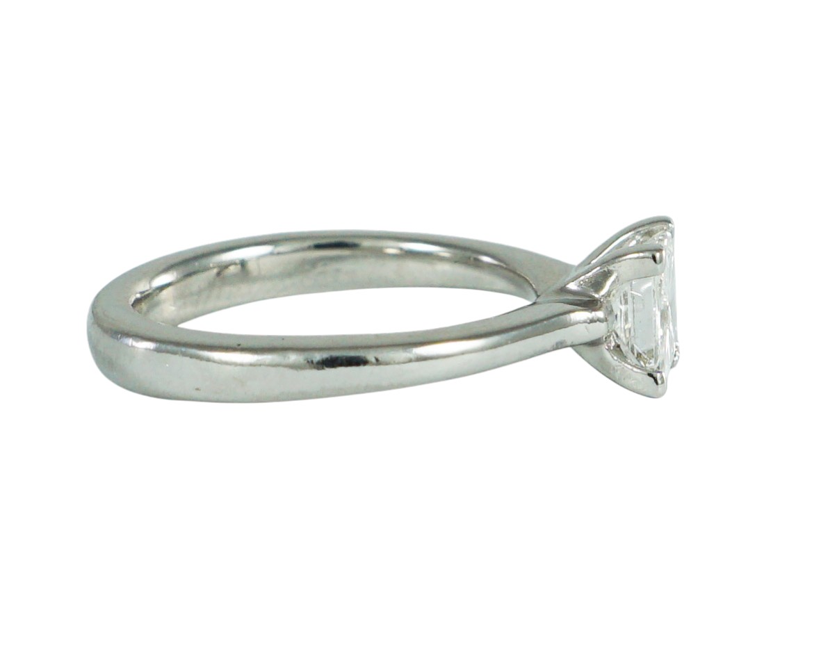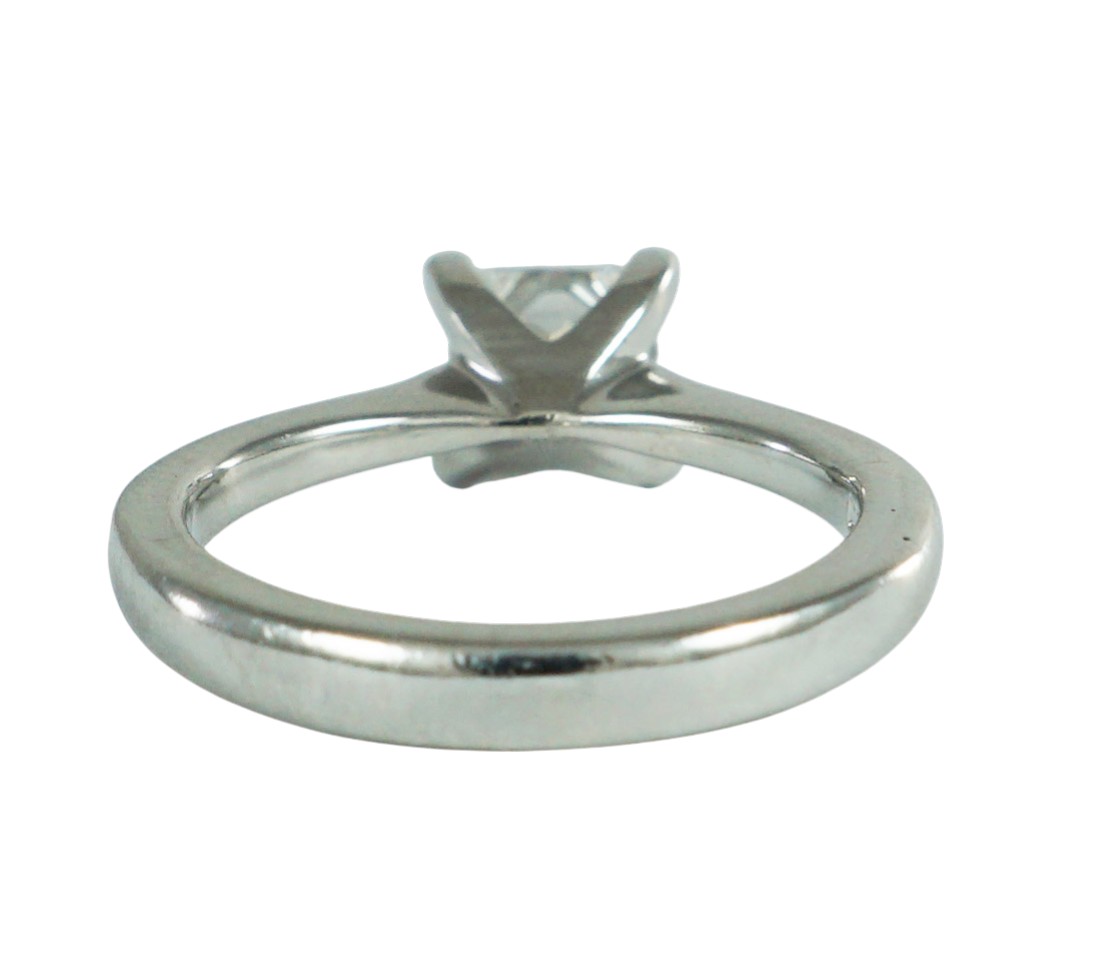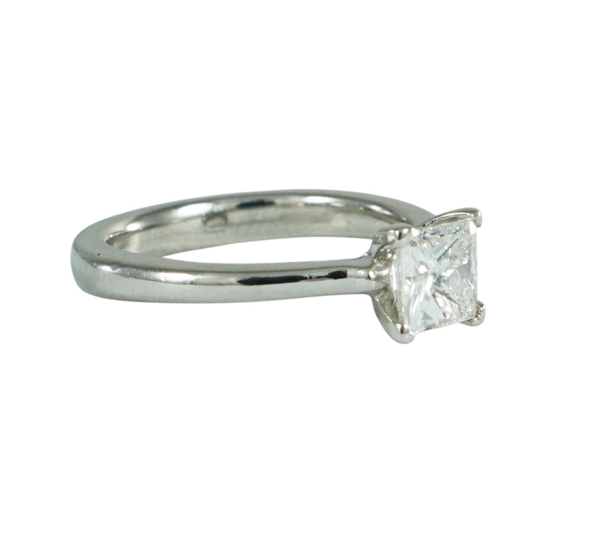 A modern Princess Cut Diamond ring claw set in a Platinum mount