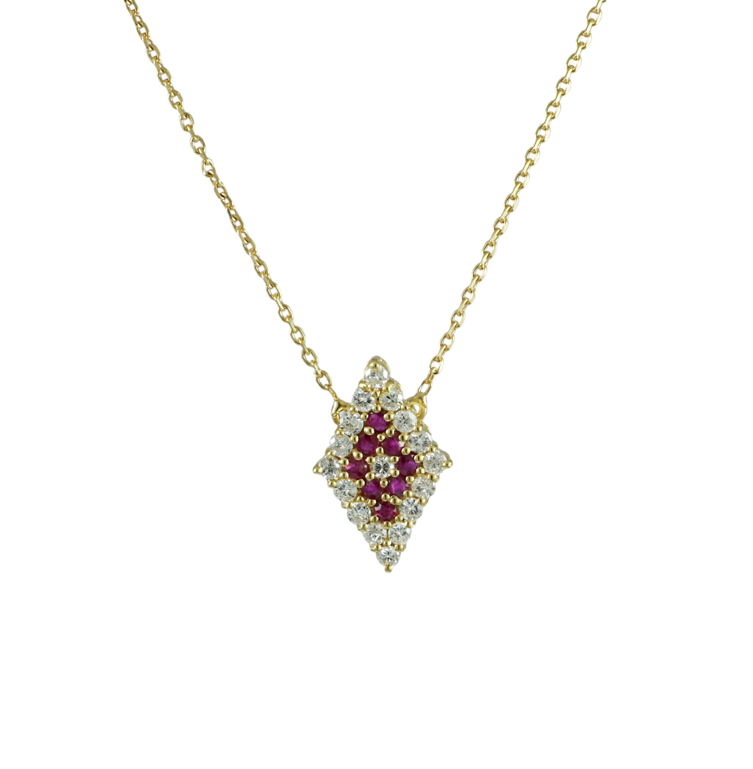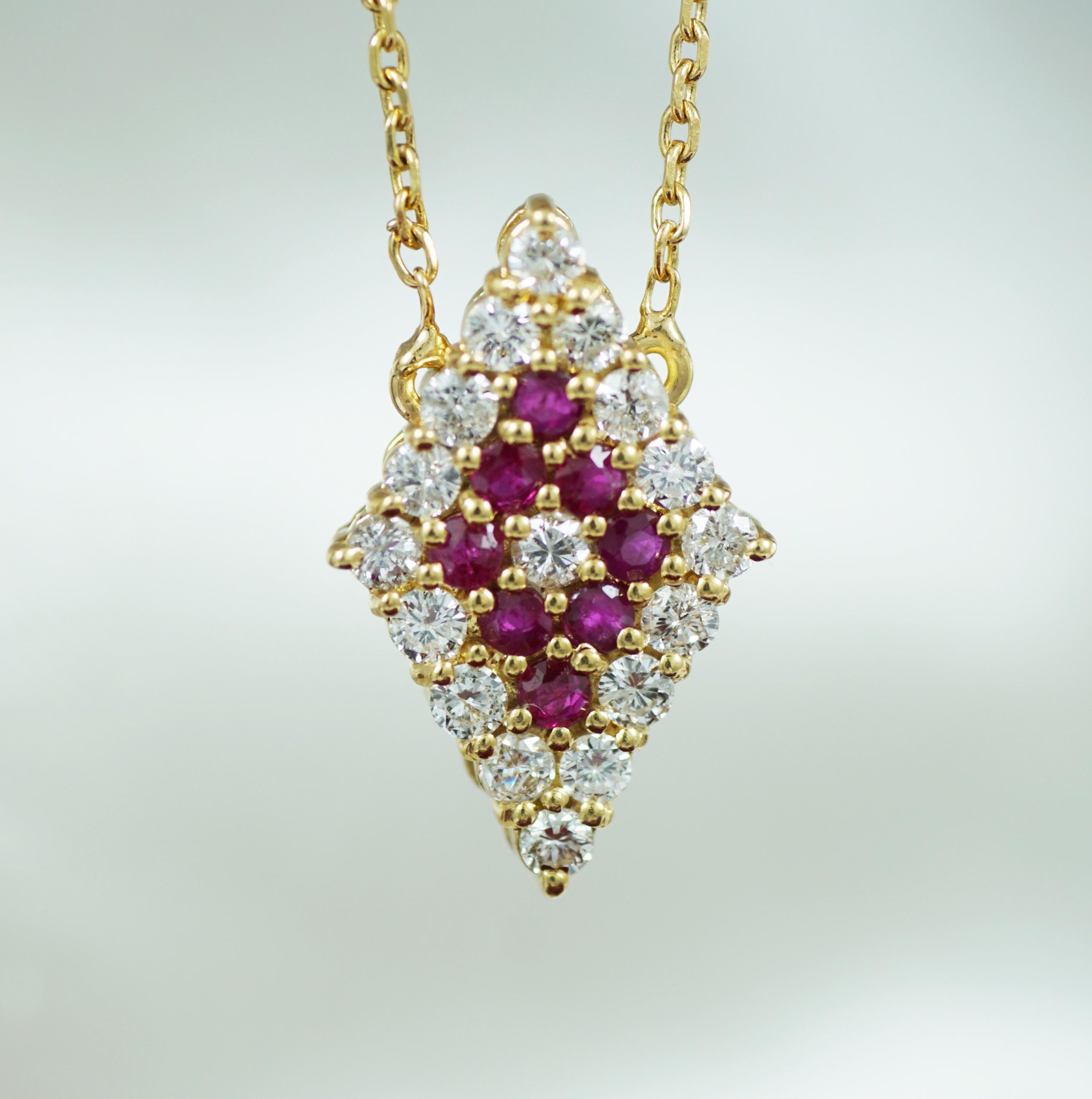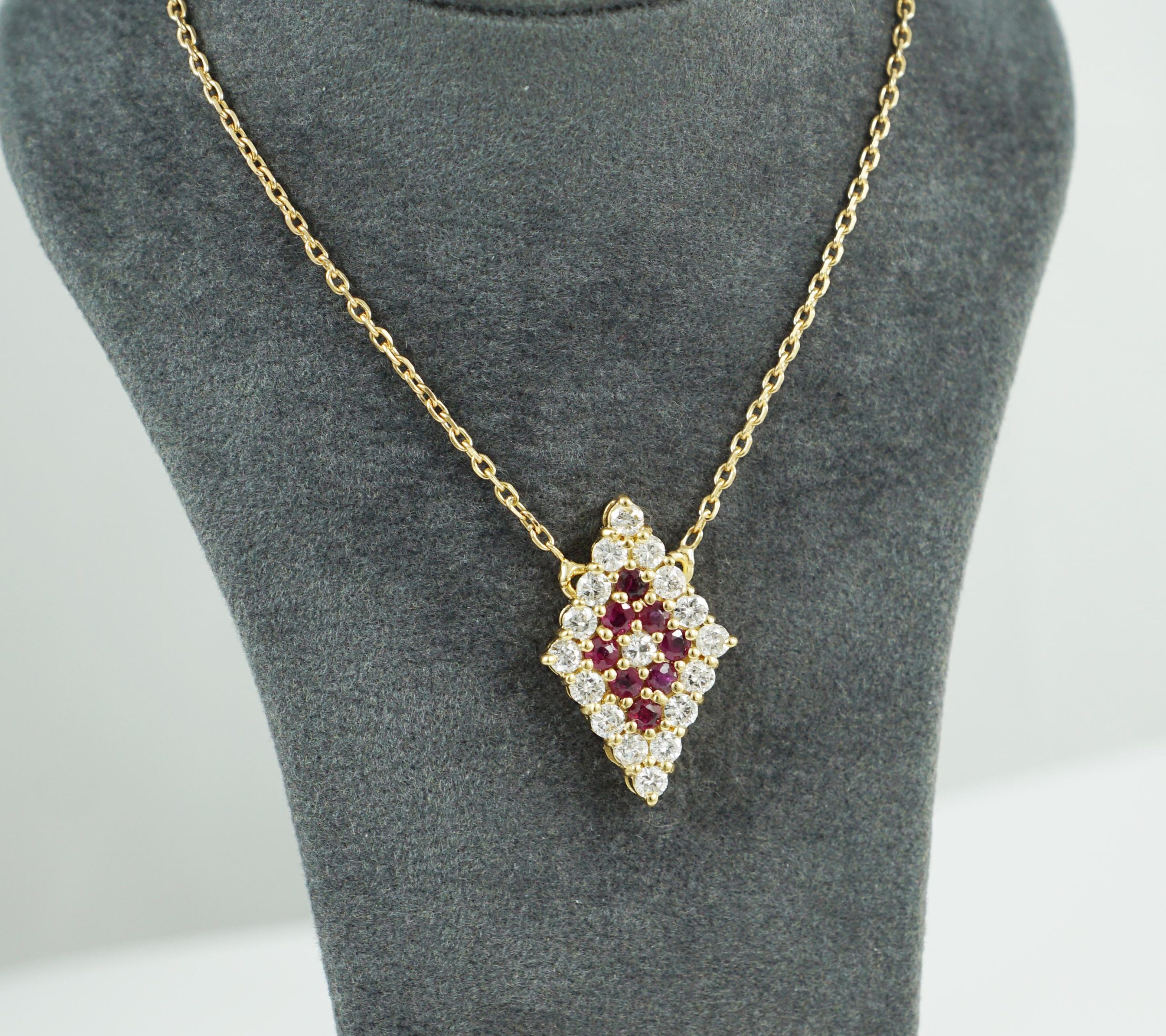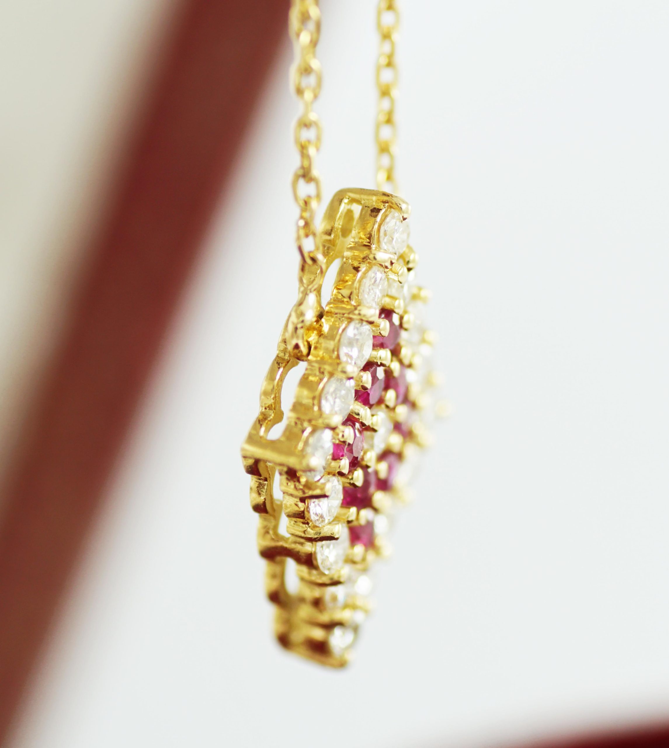 French Ruby & Diamond pendant set in 18ct Yellow Gold and suspended on a 14″ gold chain