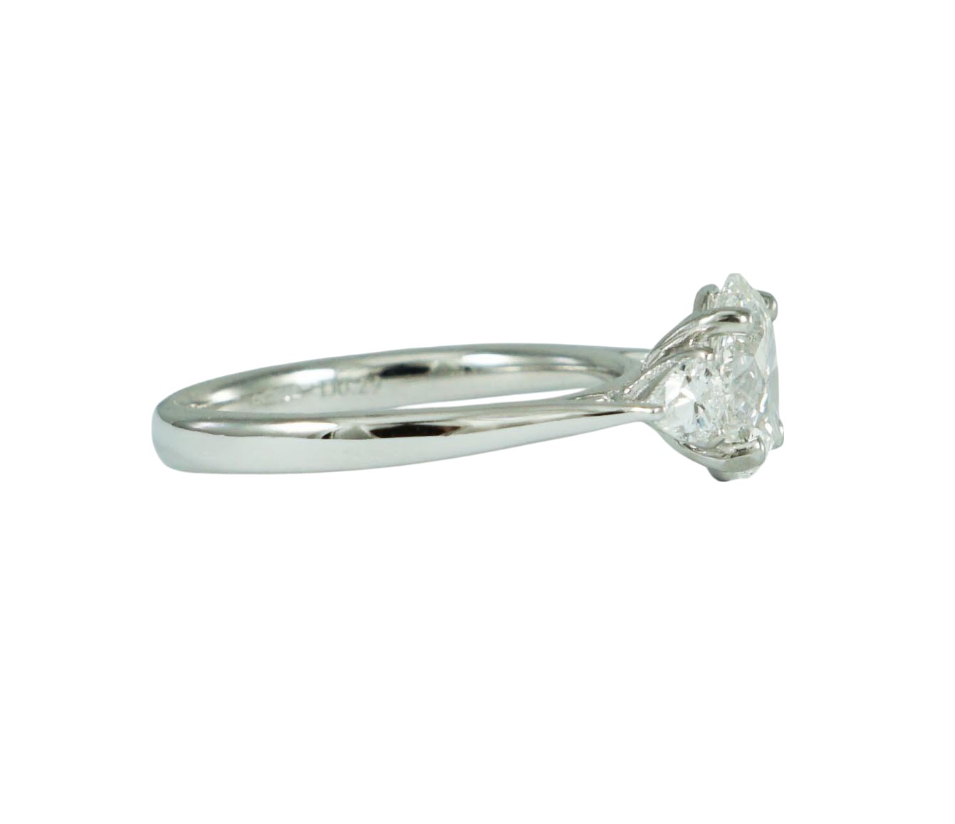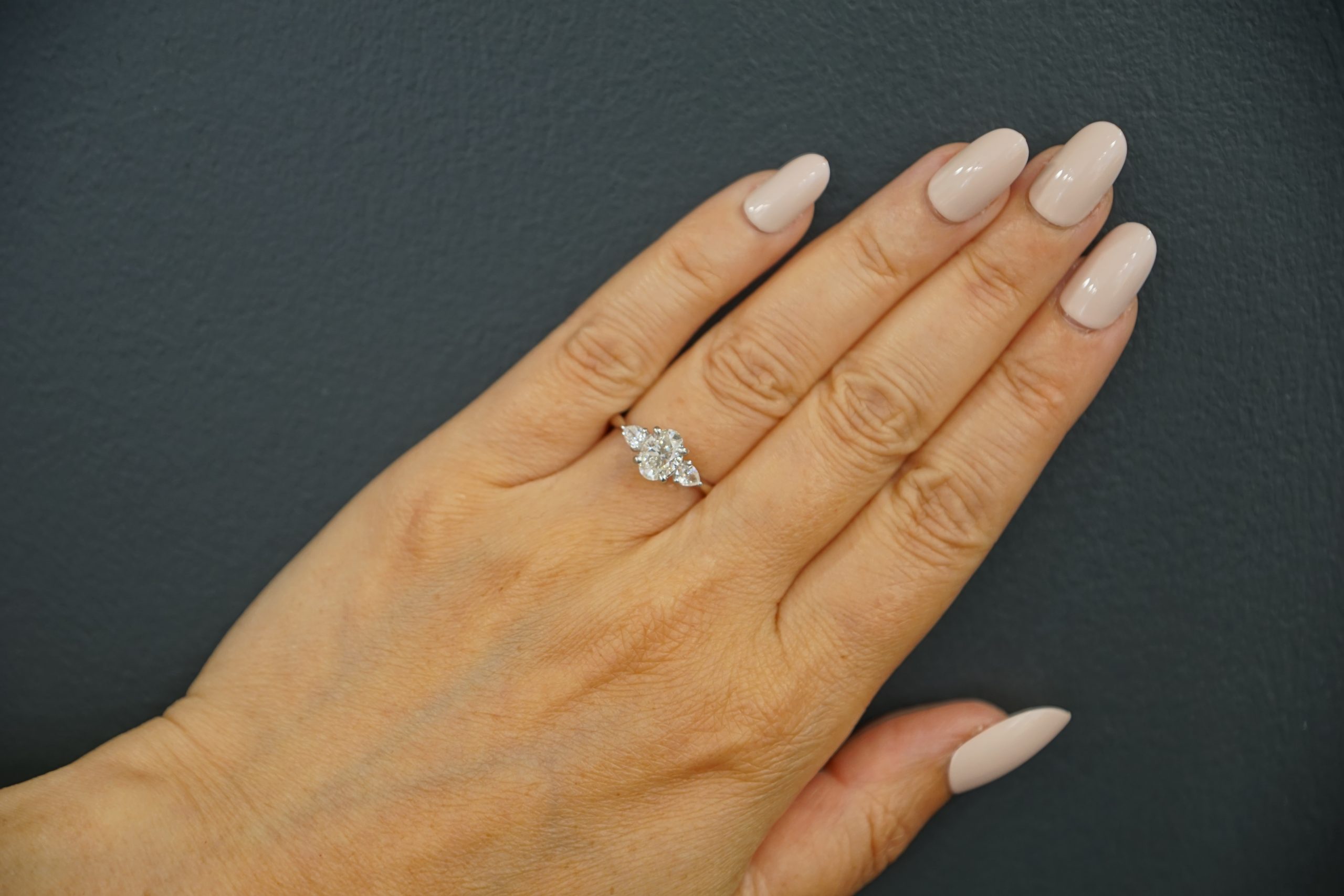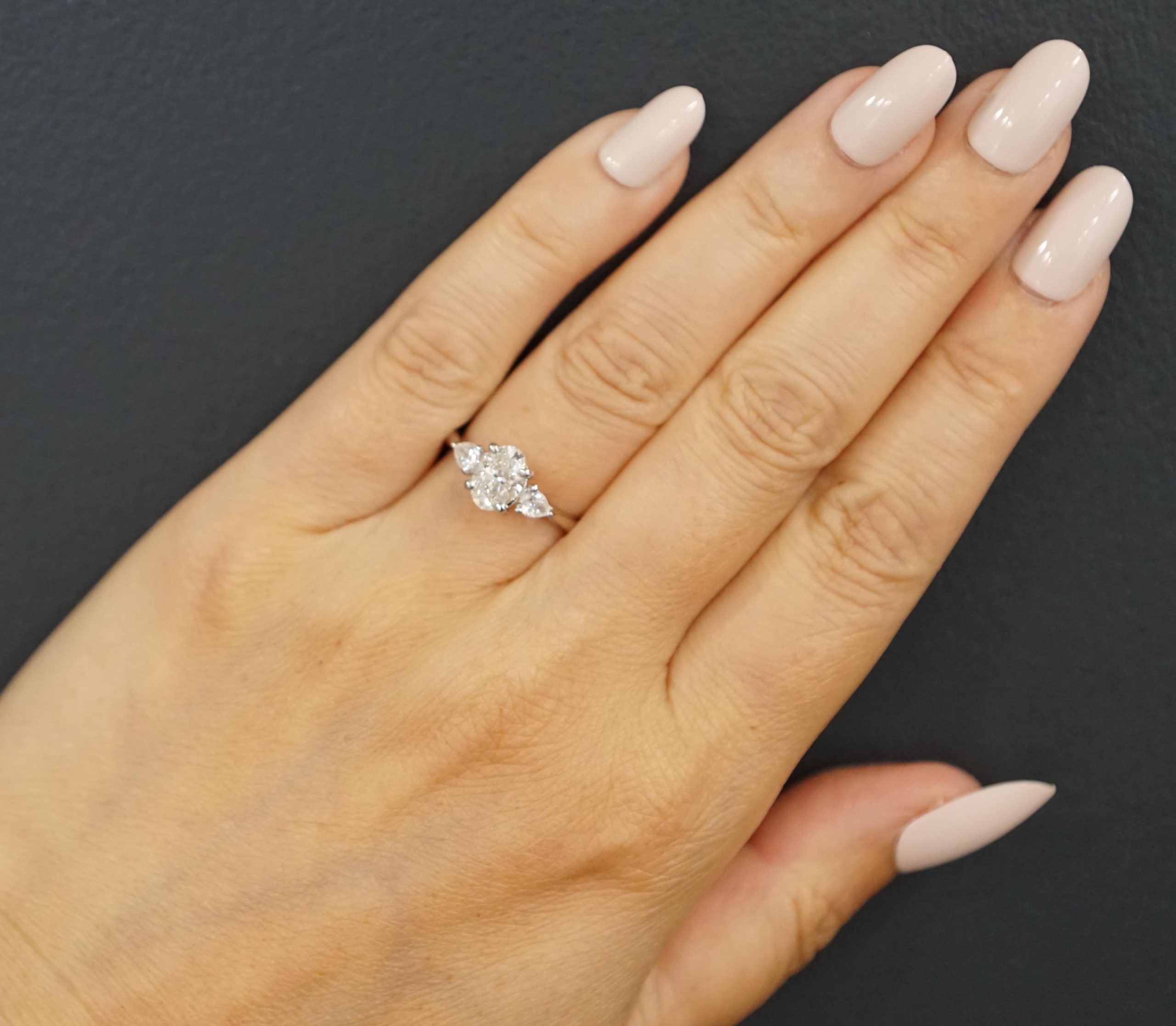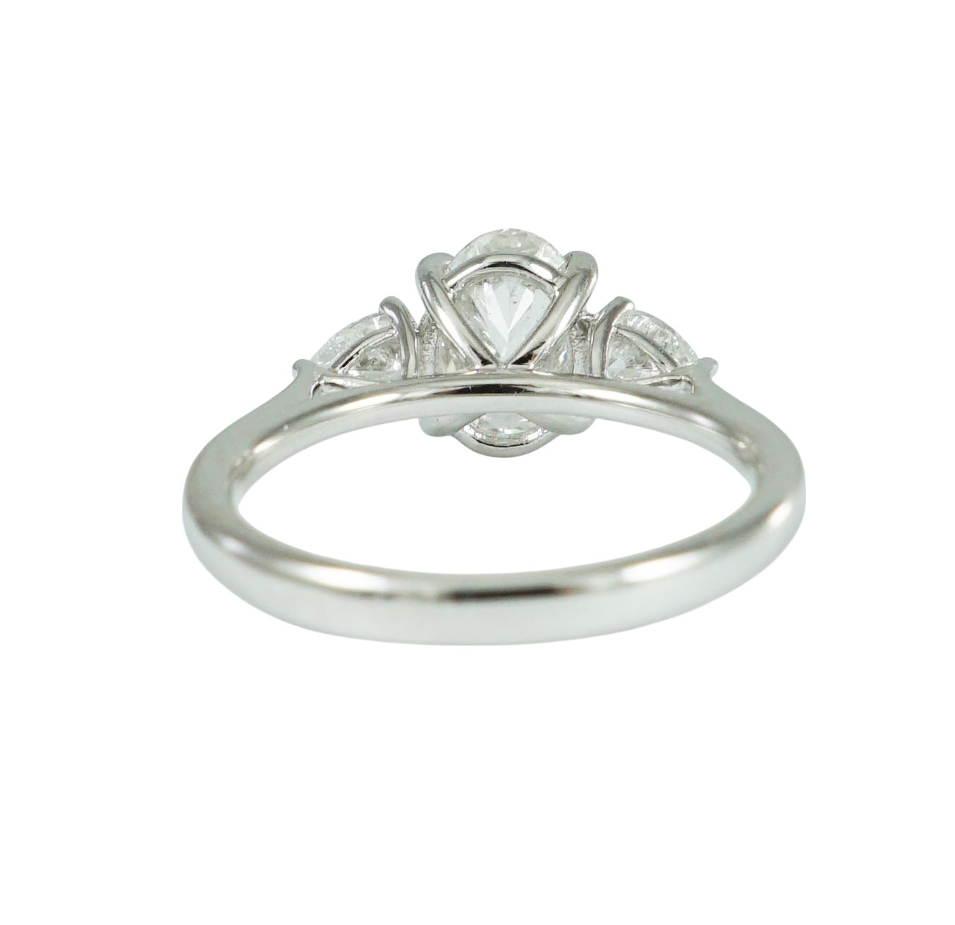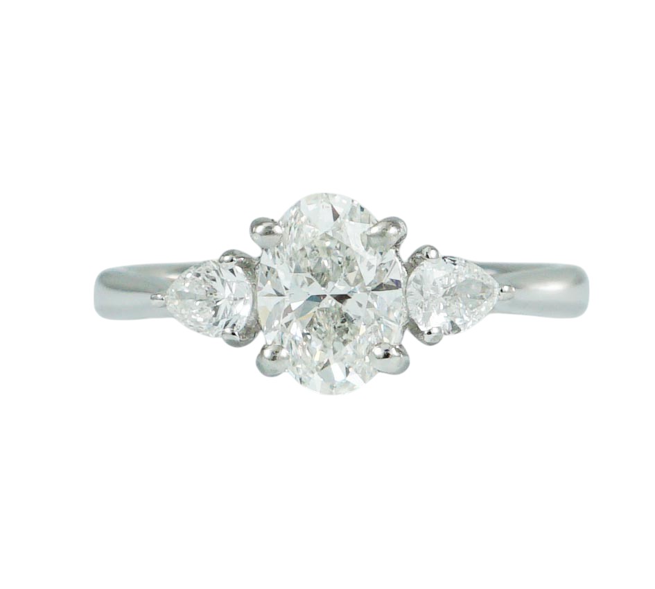 one central GIA certified oval cut Diamond claw set and flanked either side by two pear cut diamonds