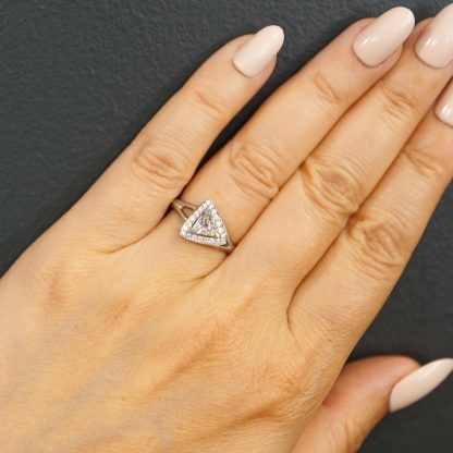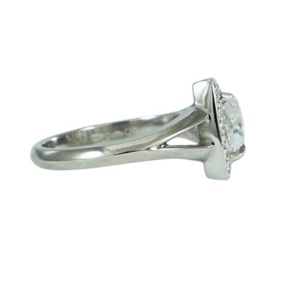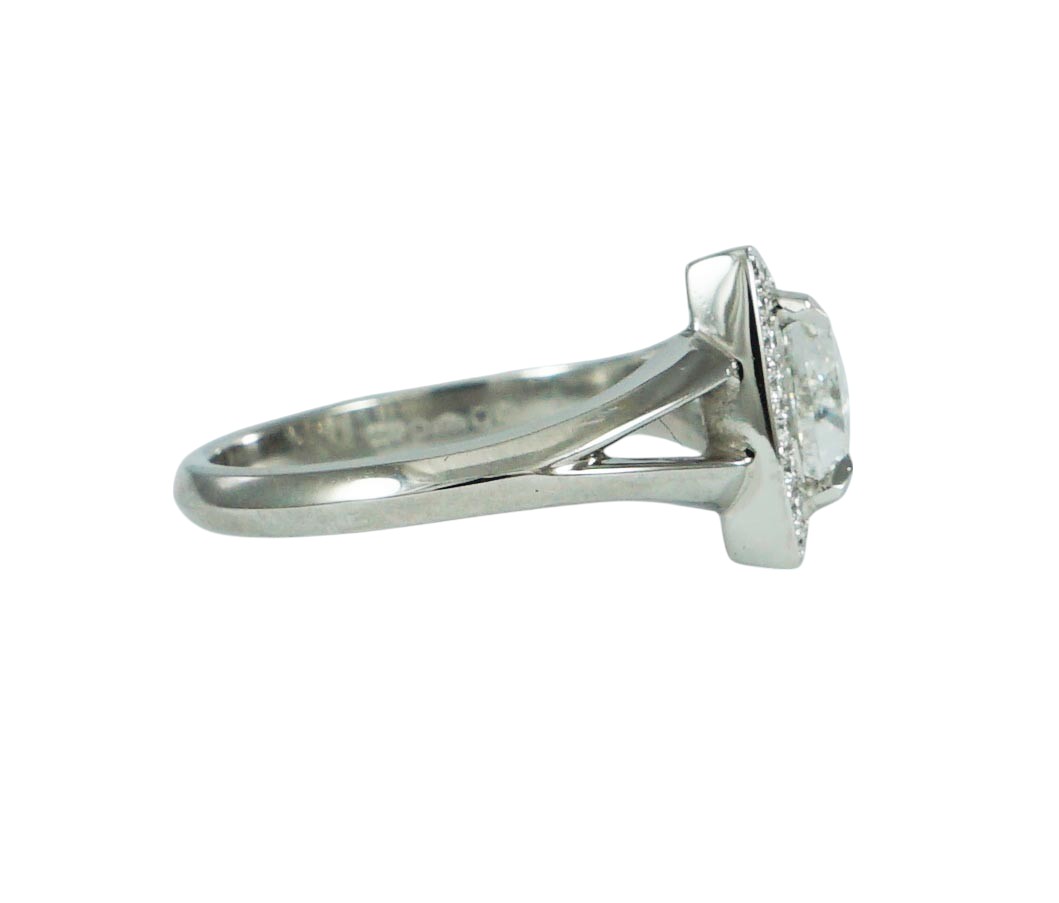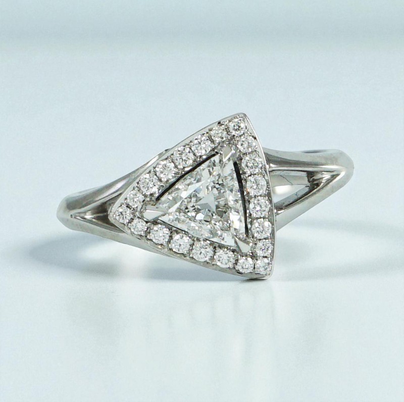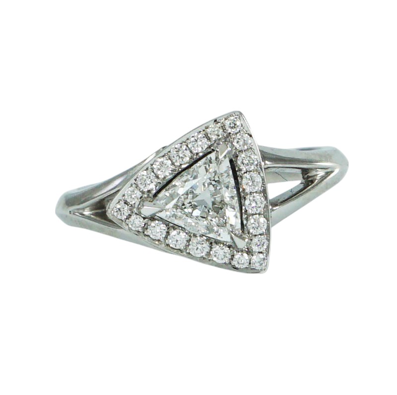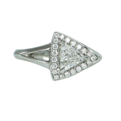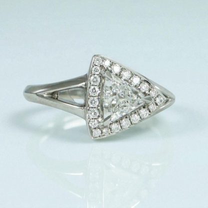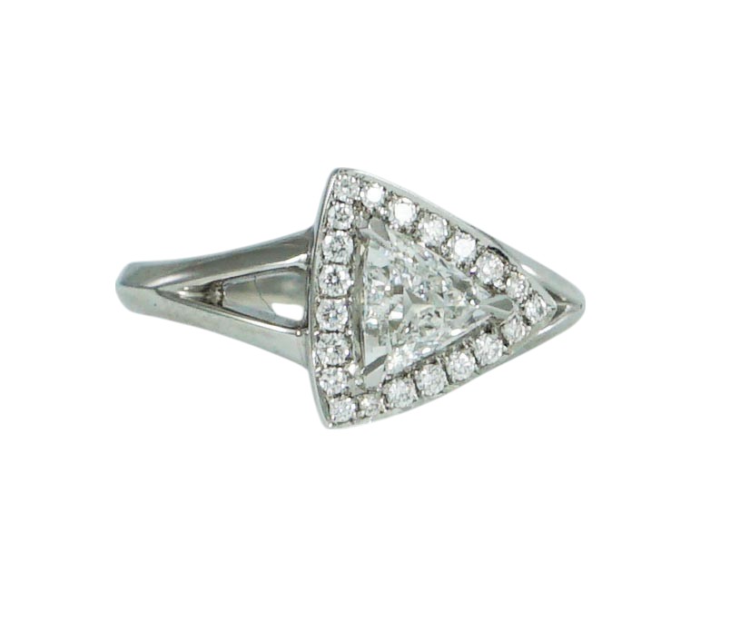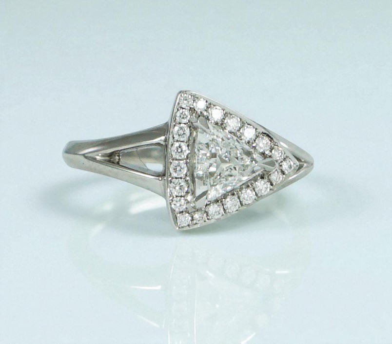 one Trilliant cut Diamond with a halo of modern round brilliant cut diamonds