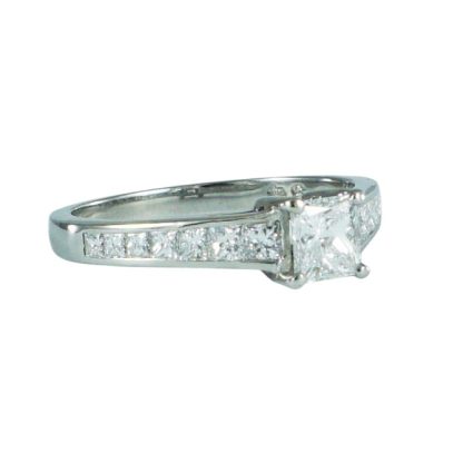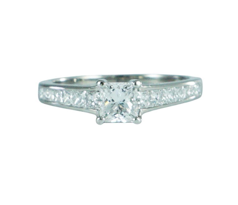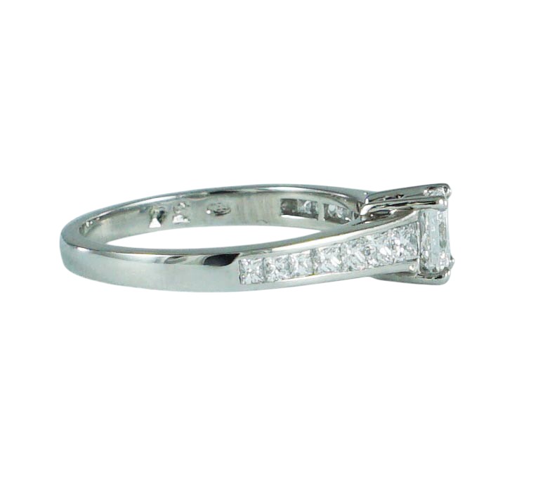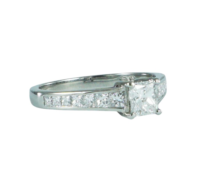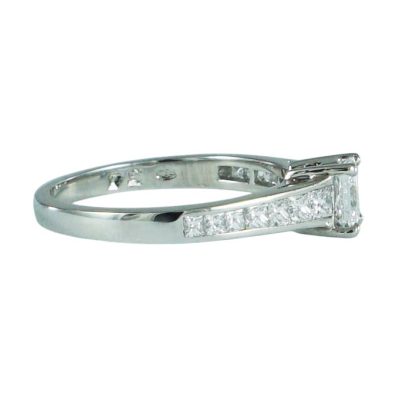 one central princess cut claw set in Platinum with seven graduated princess cut diamonds on each shoulder