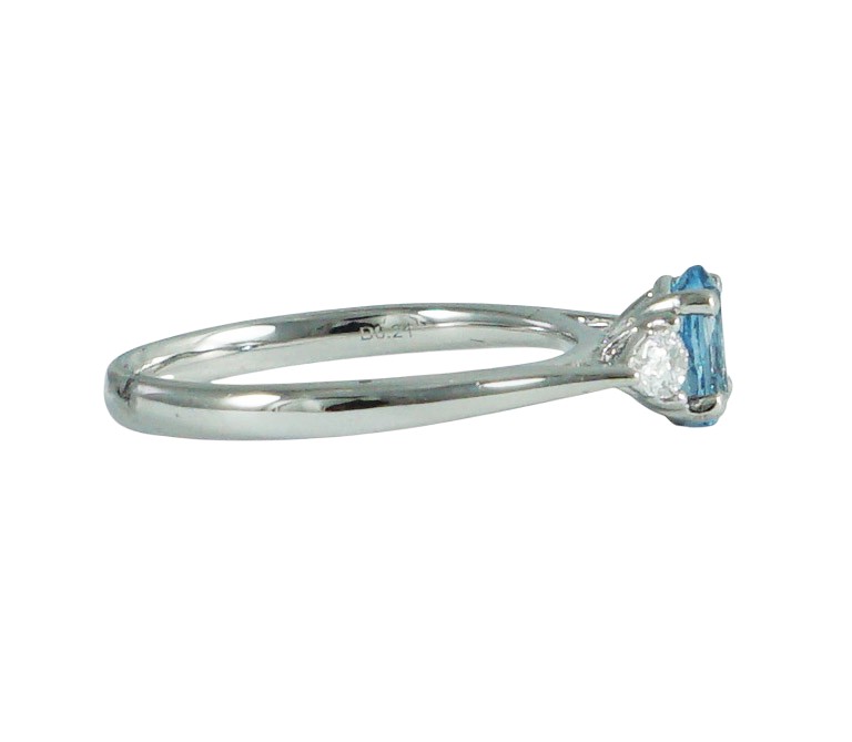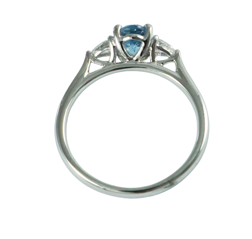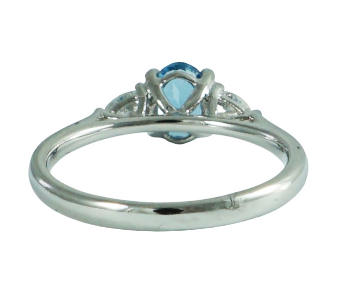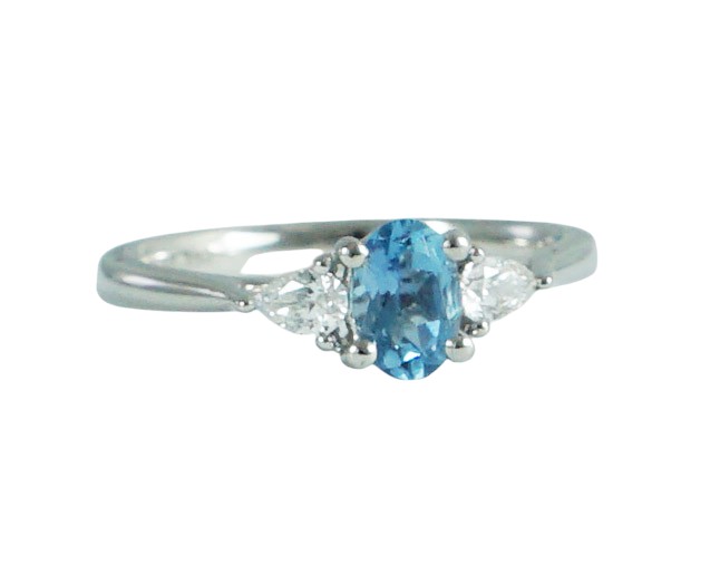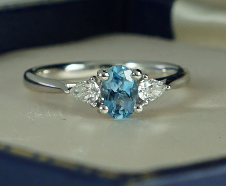 one central aquamarine oval cut and flanked either side by two pear cut diamonds