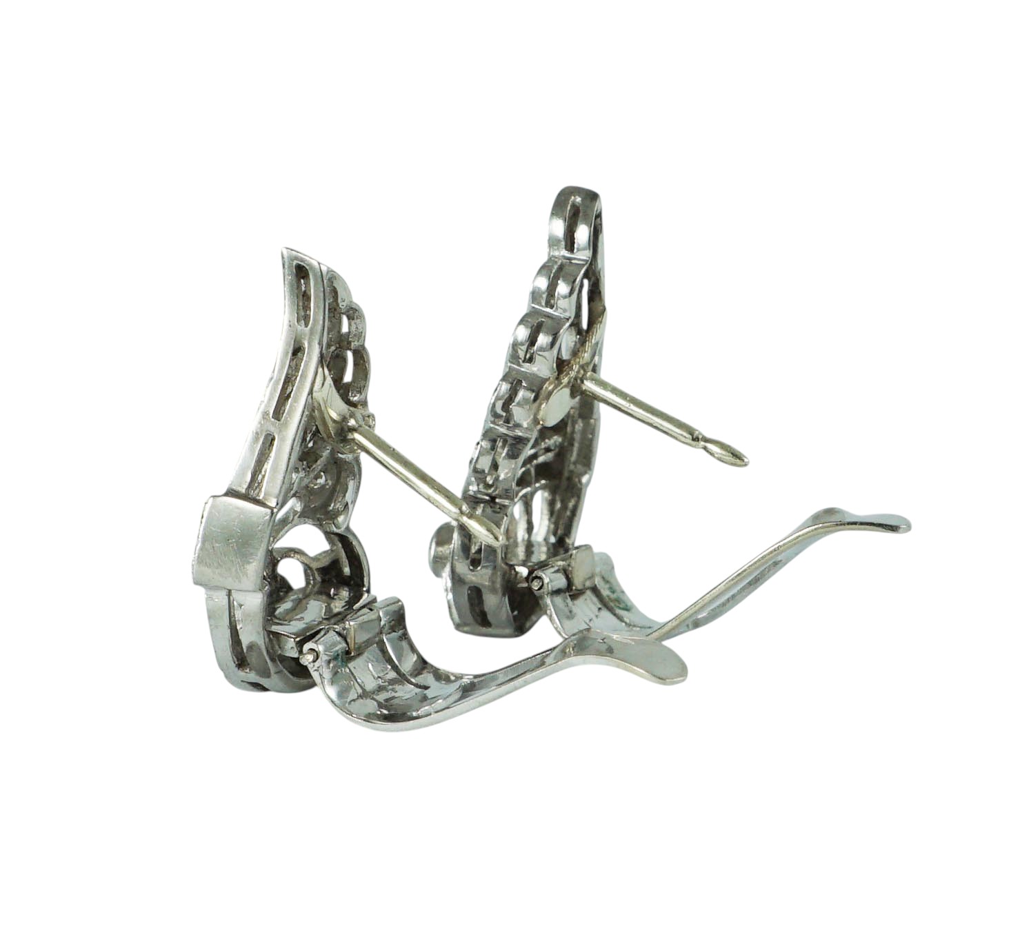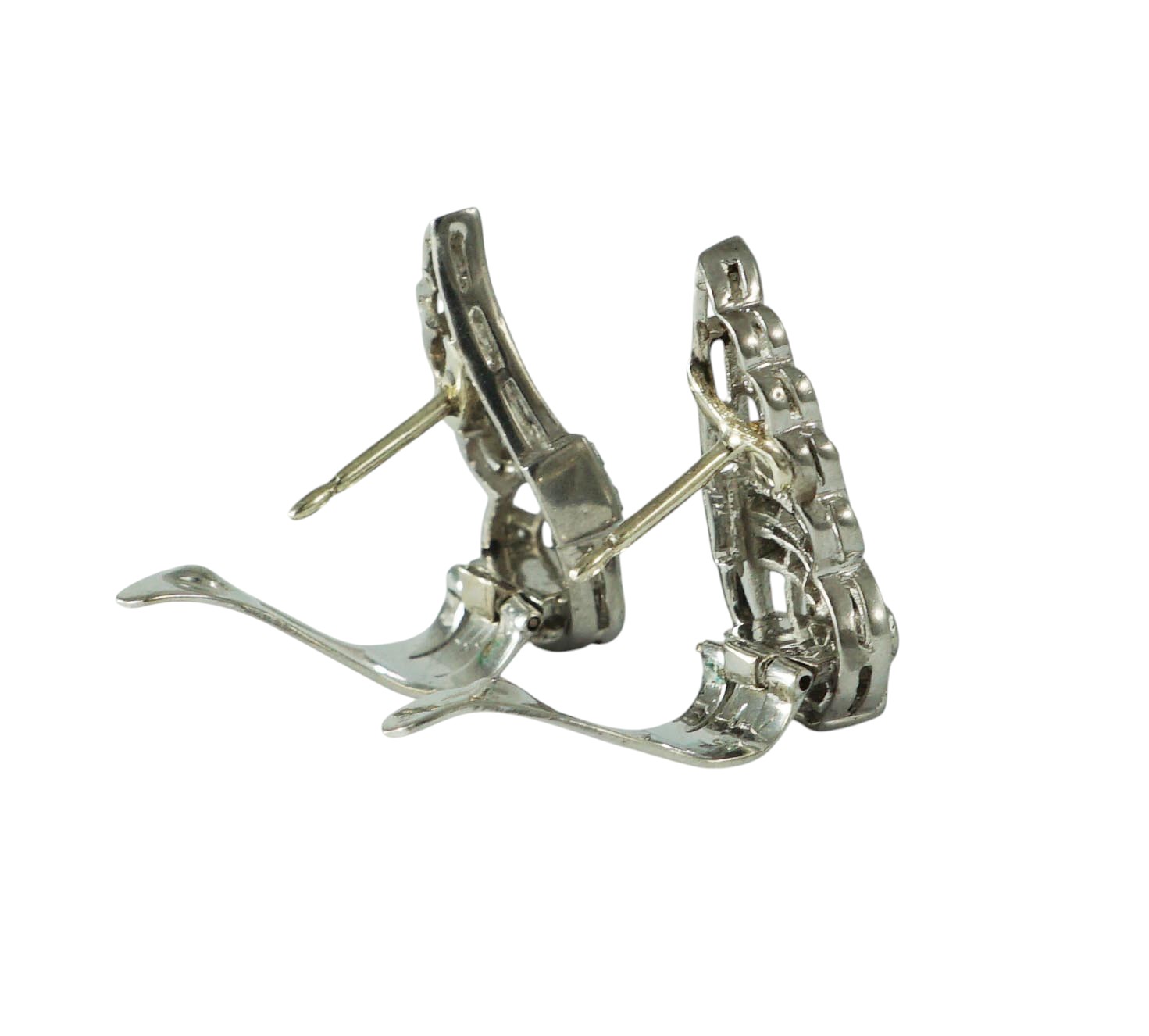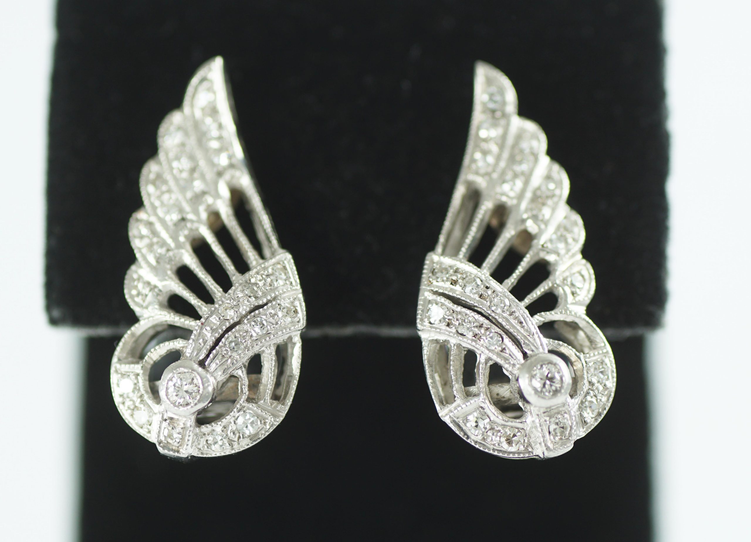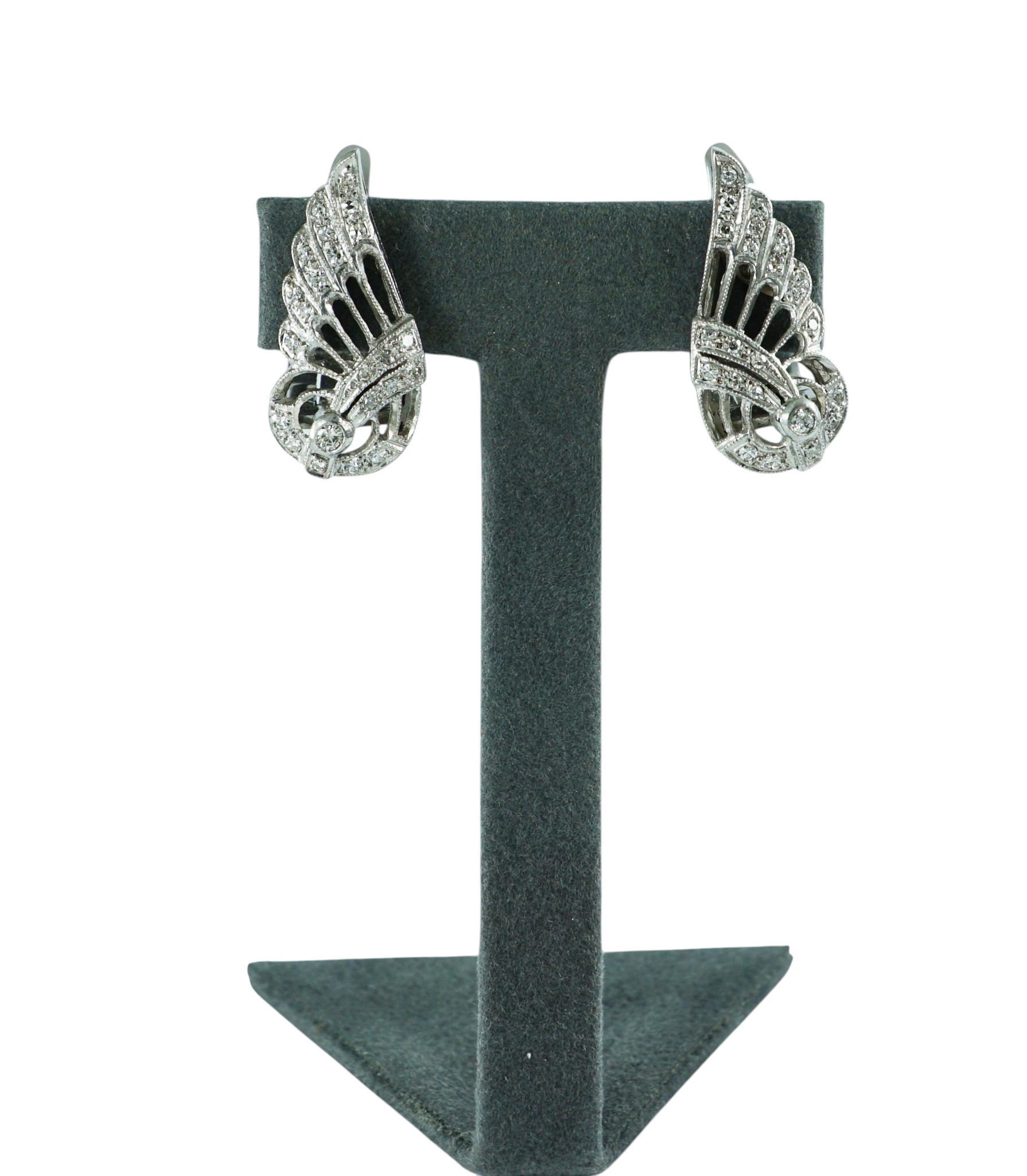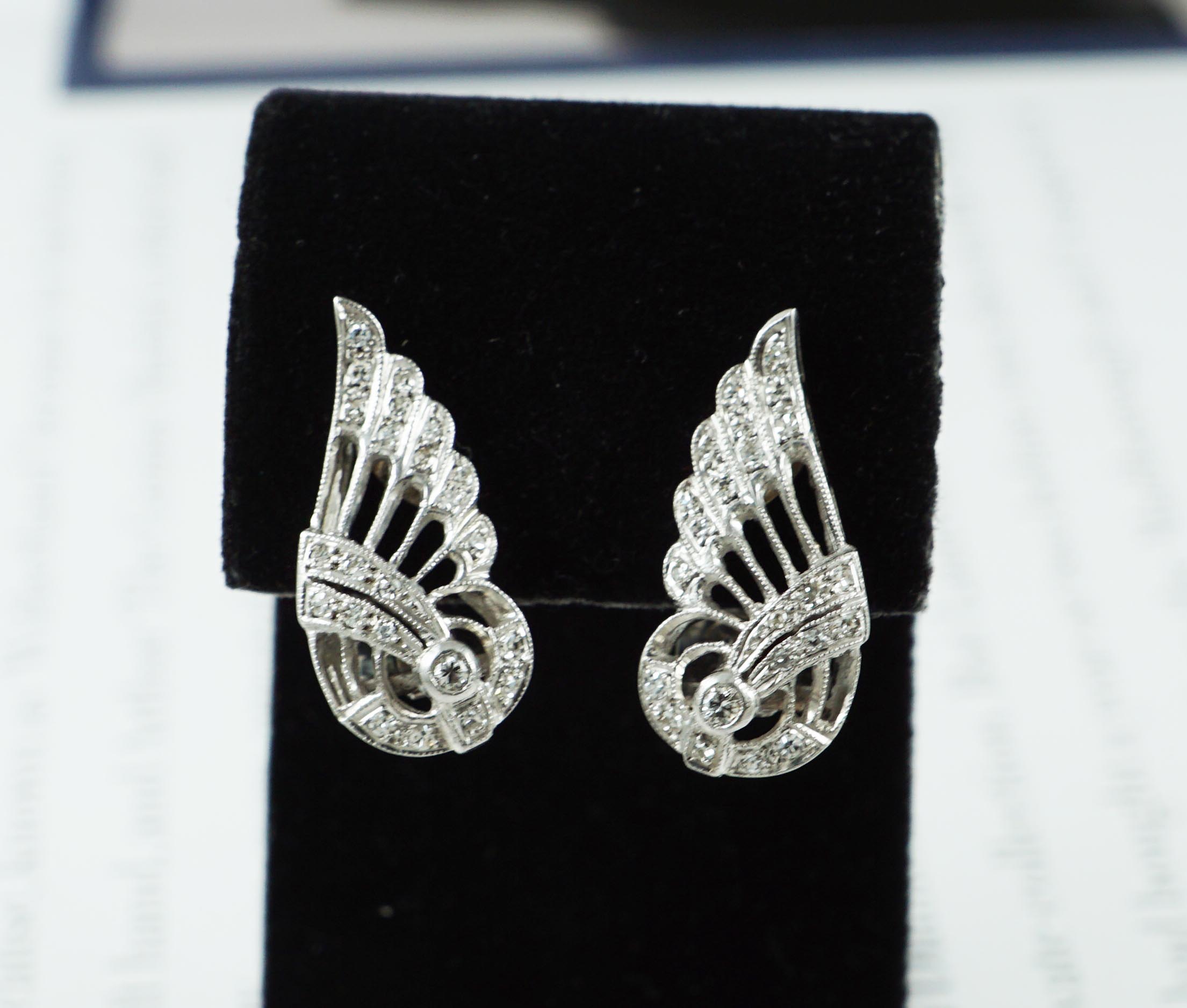 A pair of art deco diamond scrloll wing earrings set in platinum